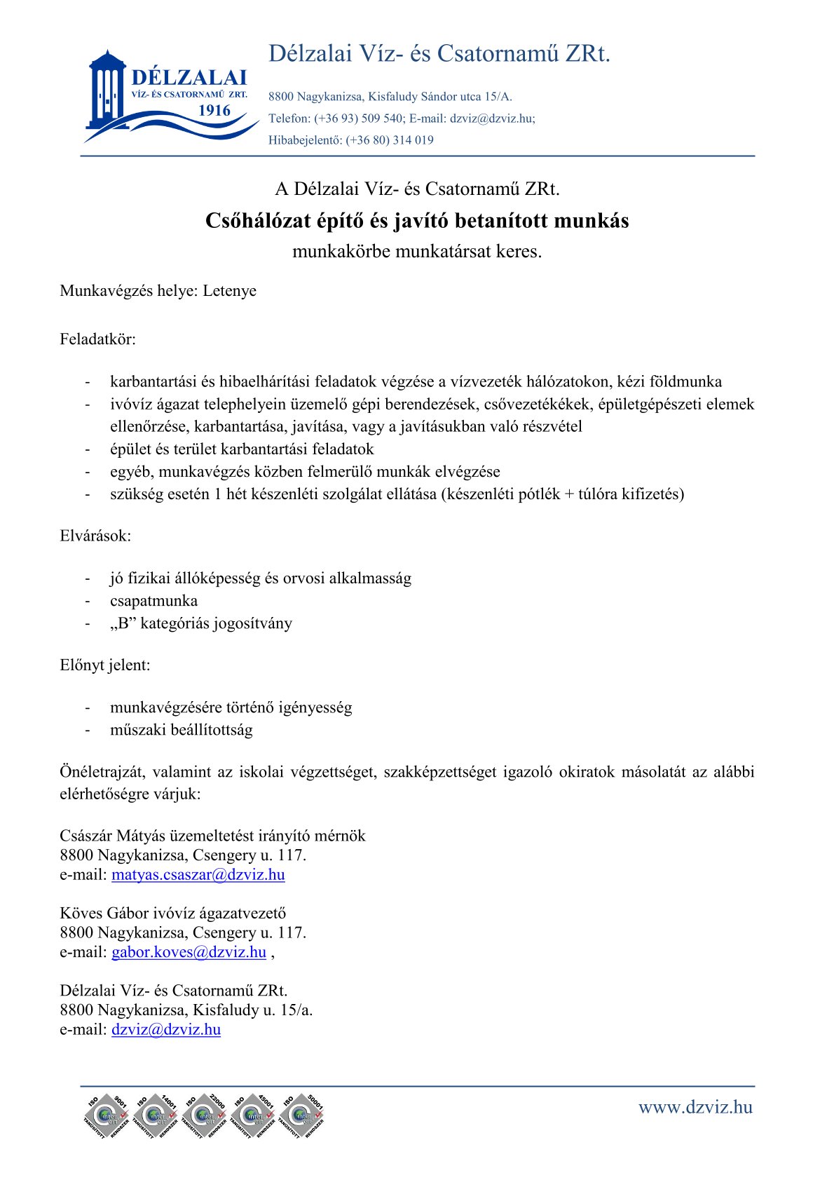 2026-01-16 - Csőhálózat építő és javító: Nagykanizsa