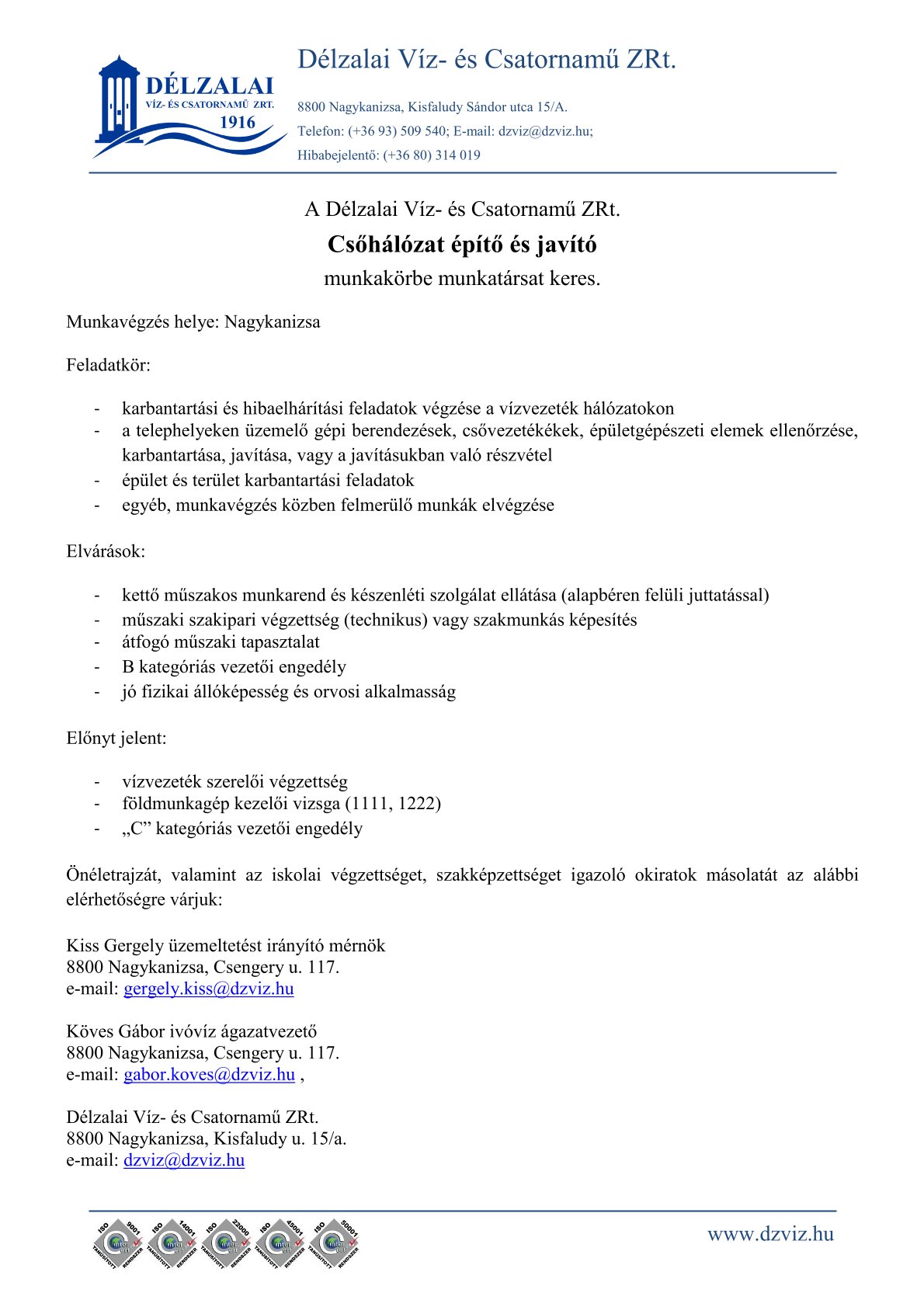2026-01-16 - Csőhálózat építő és javító: Nagykanizsa