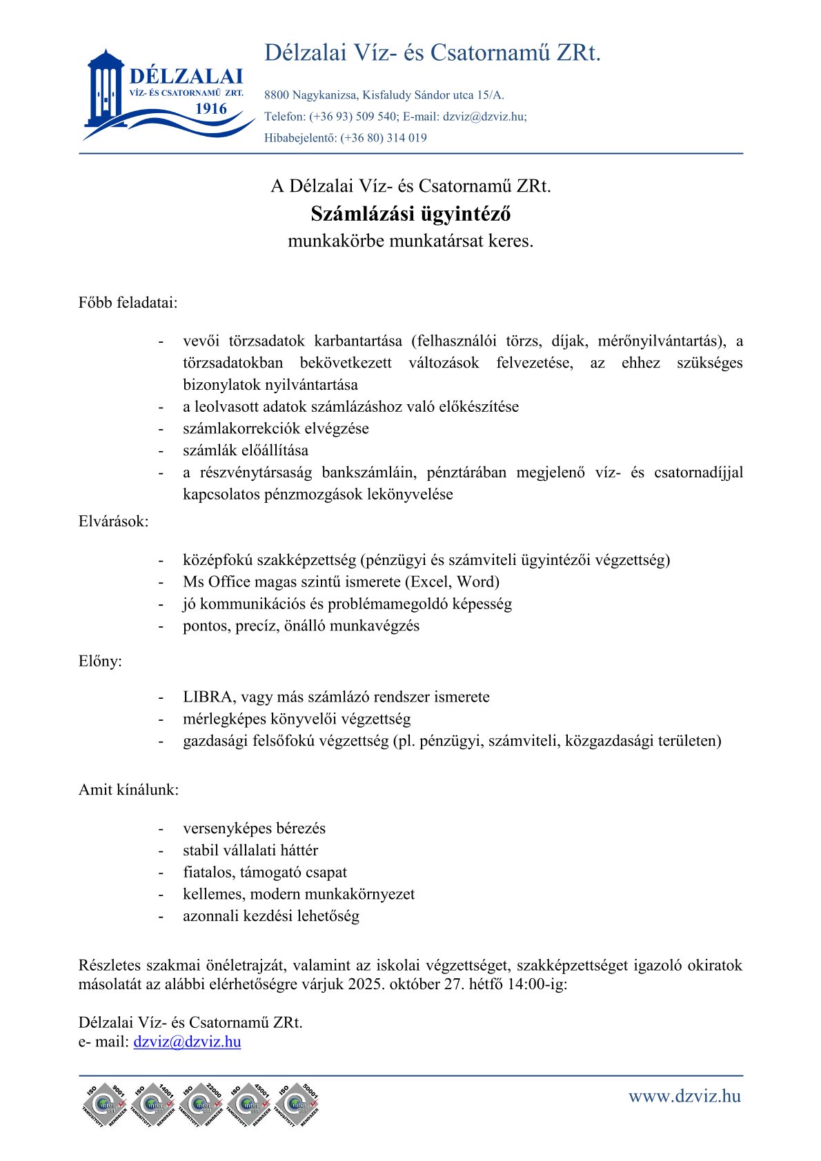 A Délzalai Víz- és Csatornamű ZRt. szolgáltatási területén számlázással kapcsolatos komplex szolgáltatás végzése